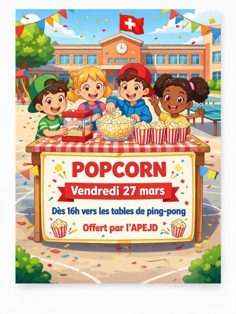 Nous serons présents dans le préau cevendredi 27 mars, dès 16hpour une grande distribution de pop-corn aux enfants. Afin de partager ce moment festif tous ensemble, les élèves inscrits au parascolaire ce jour-là recevront également du pop-corn, qui sera distribué dans le cadre de l’accueil du GIAP.